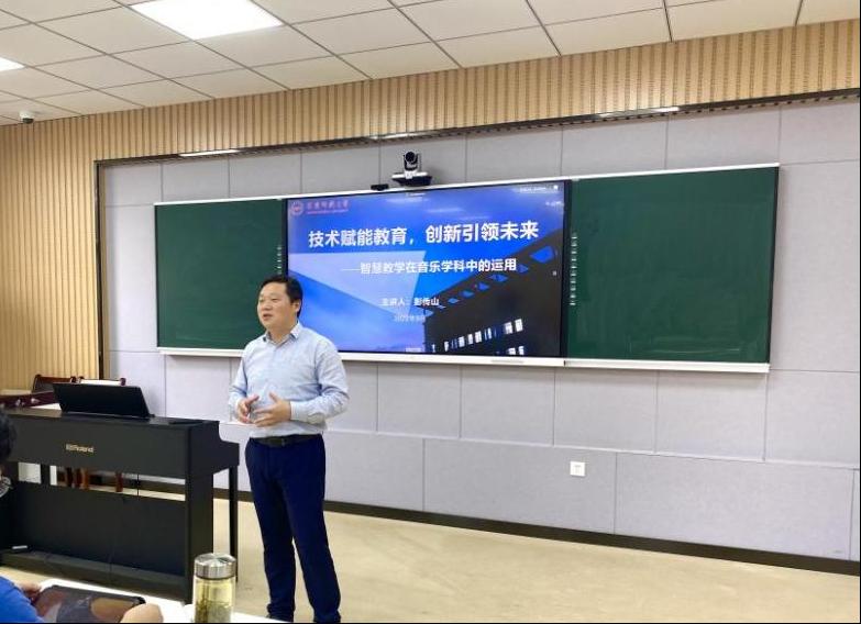 为进一步加快推进信息技术与公司产品融合创新,助力教师熟练应用智慧教学手段和方法,提高教学能力和教学效果,推进“互联网+教学”改革进程,9月28日下午,tyc33455cc太阳成集团在智慧教室举办“智慧教学在音乐学科中的运用”的教学专题讲座,由tyc33455cc太阳成集团副经理彭传山主讲、副经理徐冉主持,教务处副处长阮建玲参与指导,公司全体教职工及部分研究生到场聆听。