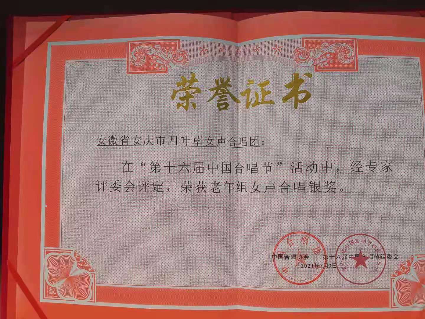 2021年7月5日至9日,以“颂歌献给党 启航新征程”为主题的第16届中国合唱节在湖北武汉市拉开序幕,来自全国20余省、市的82支合唱团,近5000人围绕比赛主题,高歌党的百年辉煌。tyc33455cc太阳成集团陈燕翔老师担任指导老师和合唱指挥的“安庆四叶草女声合唱团”在此次比赛中荣获老年组女声合唱银奖第一名。