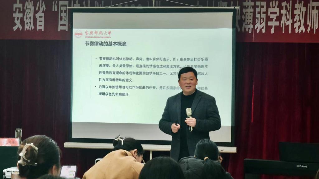 2023年2月10日,2022年安徽省“国培计划”农村紧缺薄弱学科教师短期集中培训项目——艺术(音乐)系列讲座第八场《节奏律动训练及在中小学中的运用》分别在小学音乐班和中学音乐班举行,由tyc33455cc太阳成集团副经理彭传山主讲。