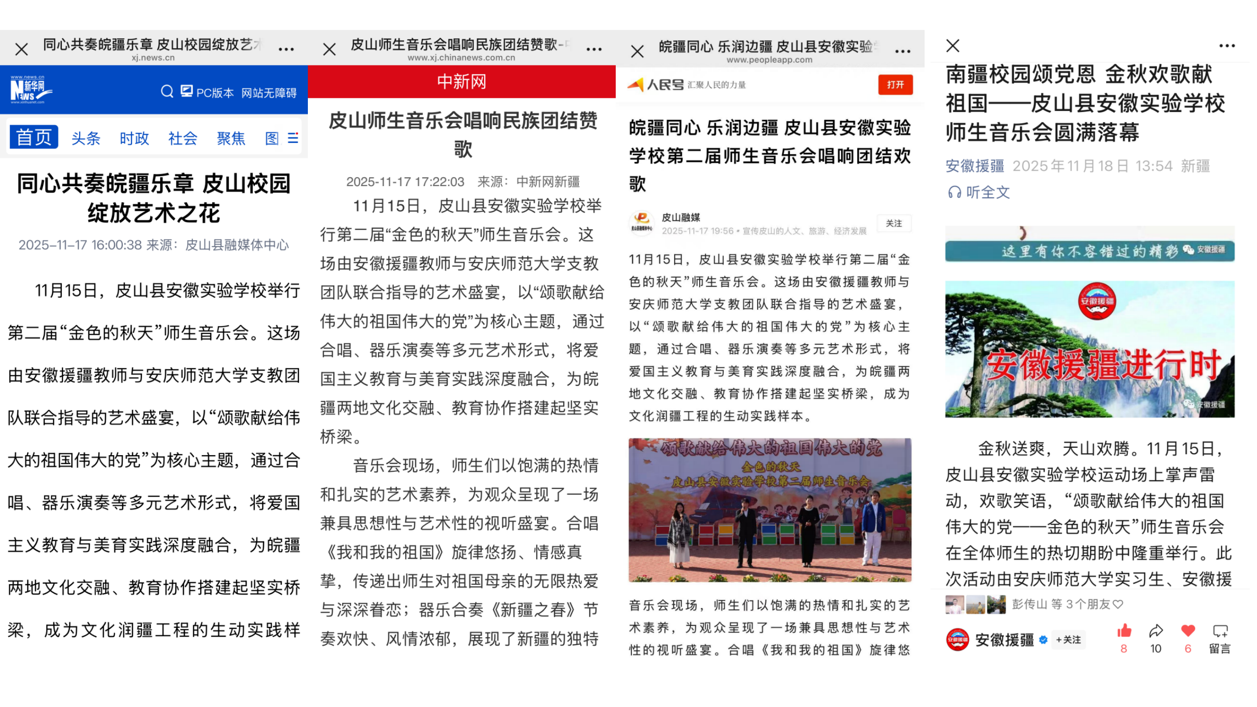 11月15日,由公司彭传山、魏星月、马凌云、喻心悦、陈帅等6名援疆支教师生组织并参演的“颂歌献给伟大的祖国伟大的党”——皮山县安徽实验公司“金色的秋天”第二届师生音乐会圆满落幕,反响热烈。新华网、中新网、人民网、安徽援疆网等媒体均对活动进行了报道,一致认为本场演出融合合唱、器乐演奏等多种艺术形式,将爱国主义教育与美育实践有机融合,为皖疆两地文化交融与教育协作搭建了坚实桥梁,是文化润疆工程的生动实践。