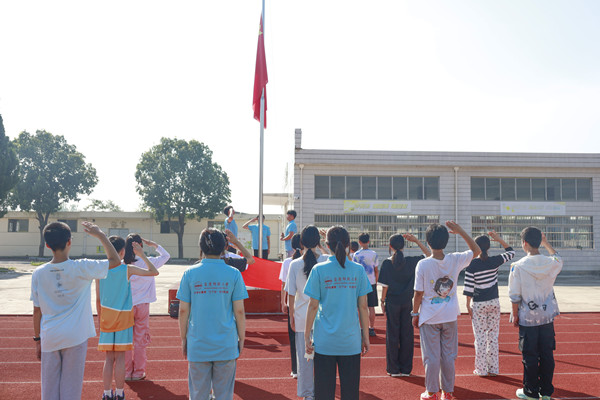七月的腊树中学操场热浪蒸腾,却掩不住少年们眼中的专注与庄重。伴随《出旗曲》奏响,红色队旗在护旗手稳健的步伐中向前移动,倾斜45度的旗面掠过炽热阳光。全体少先队员五指并拢高举头顶,标准的队礼无声诉说着对组织的赤诚。在“音为爱”团队的精心组织下,“红领巾爱祖国”少先队仪式教育庄严展开。