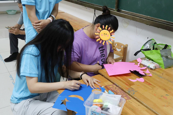 “在日常生活中,小朋友喜欢与音乐一起律动吗?在课堂上,小朋友能否与老师一起互动?”孙国鑫以提问切入交谈。拿起卡纸、画下图形、裁剪整理……不久,许多彩色的手绘图形跃然桌上,“这些手工作品都是小朋友们上课所必需的,我想尽自己的努力,为小朋友和家长带来关心与帮助。”她如是说。在初步知悉教学模式与课堂情况后,其他实践队员也分好组别,加入准备工作。